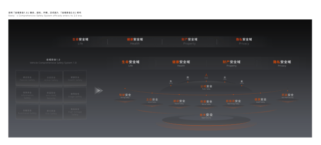 作为行业安全技术的先行者与引领者,吉利在“全域AI”技术体系的赋能下,以“AI为纲 责任为本”,基于原有的“全域安全”技术体系进阶打造“全域安全2.0”技术体系。结合智能时代的安全新需求和新挑战,“全域安全2.0”技术体系秉持“以人为尊”理念,通过技术升级、能力突破与范式创新,将侧重“整车安全”的视角升级为“人-车-路-云-星”的生态视角,旨在贯穿用户出行全场景、覆盖出行全领域、联动出行全生态;并以“生命零伤亡、健康零危害、财产零损失、隐私零泄露”四大安全愿景为指引,逐步构建的一套为消费者提供全面的安全保障技术体系。