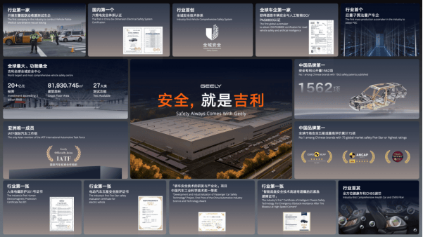 “安全,就是最大的吉利”这一信念已深植企业发展基因:2000年,李书福董事长销毁上百台质量不合格的豪情汽车,奠定“造高品质安全好车”的发展基石;2007年,发布《宁波宣言》,确立“安全第一”的研发最高战略;2010年收购沃尔沃后,吉利深度融合其安全理念与技术积淀,实现自身安全标准实现跨越式提升,并以此为根基构建专属安全技术体系——从2016年首创“安全识别圈”体系,到2020年提出“全域安全”技术体系,CMA、SEA等世界级智能安全架构相继落地,高强度安全车身、健康安全座舱等硬核技术成果广泛应用,持续带动中国汽车产业聚焦安全核心赛道。
