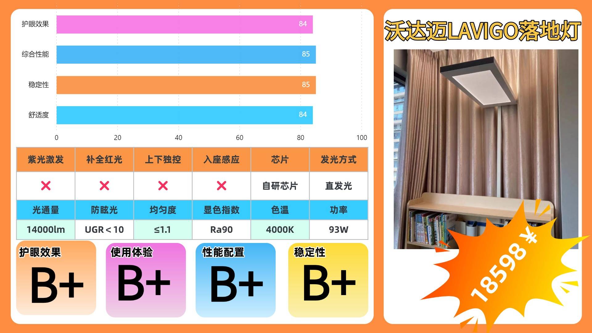 大路灯护眼灯第七名:沃达迈LAVIGO落地灯;能够呈现14000lm的光通量,亮度表现充足。