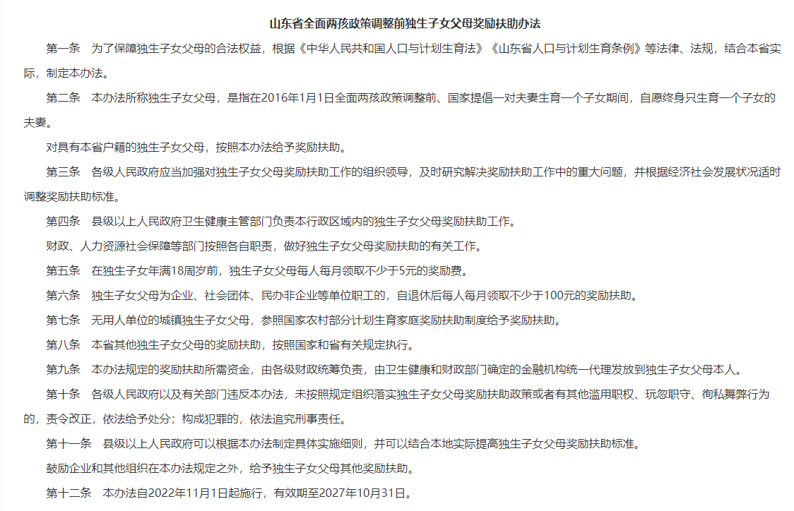 山东:企业职工每月 100 元,根据山东省 2022 年实施的《全面两孩政策调整前独生子女父母奖励扶助办法》,2016 年 1 月 1 日前自愿只生育一个子女的夫妻可享受以下奖励:2022 年 11 月 1 日后退休:每月领取100 元奖励扶助金,由财政统一发放至社保卡账户;