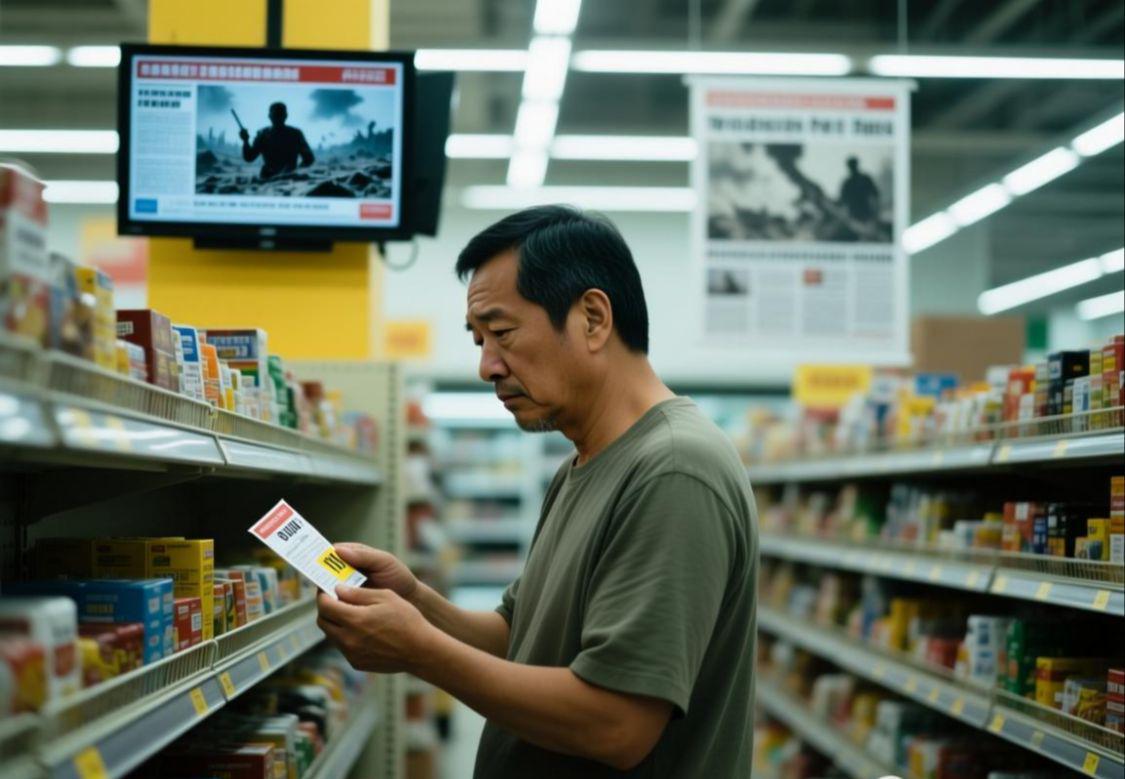 【配图说明:一张生活化场景图,一位普通人站在超市货架前看着价格标签若有所思,背景是模糊的新闻报道画面,寓意战争对日常生活的影响。】