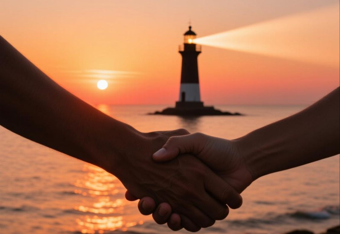 【配图说明:一张温暖而坚定的图片,一只手紧紧握住另一只手,背景是夕阳下平静的海面和远方的灯塔,象征着希望和坚持。】