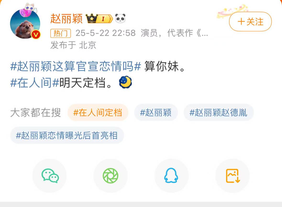 2025年5月,赵丽颖因与导演赵德胤的绯闻陷入舆论漩涡。狗仔爆料称两人多次同框并互动亲密,甚至涉及家庭场景,引发“恋情实锤”猜测。然而,赵丽颖始终未正面回应,直至5月22日,她以一条“算你妹”的微博直接否认“官宣恋情”的关联猜测,同时宣布主演悬疑剧《在人间》次日定档,将争议焦点转向作品宣传。