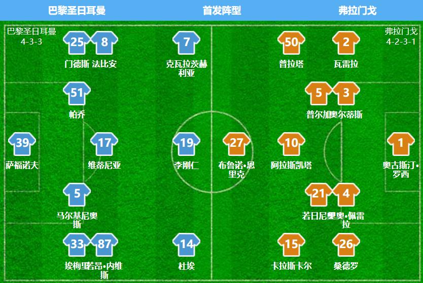 巴黎vs弗拉门戈,恩里克排出433阵型,韩国中场李刚仁客串中锋,两侧是克瓦拉茨赫利亚和杜埃,若昂-内维斯、维蒂尼亚两位亿欧先生搭档法比安组成三中场,中场埃梅里客串右后卫,与马尔基尼奥斯、帕乔、门德斯组成四后卫,萨福诺夫守门,首发身价7.0亿欧元,首发平均年龄24.2岁;费利佩-路易斯排出4231阵型,首发身价仅有8050万欧元,不足1亿欧元,首发平均年龄30.5岁,切尔西旧将若日尼奥首发出战。