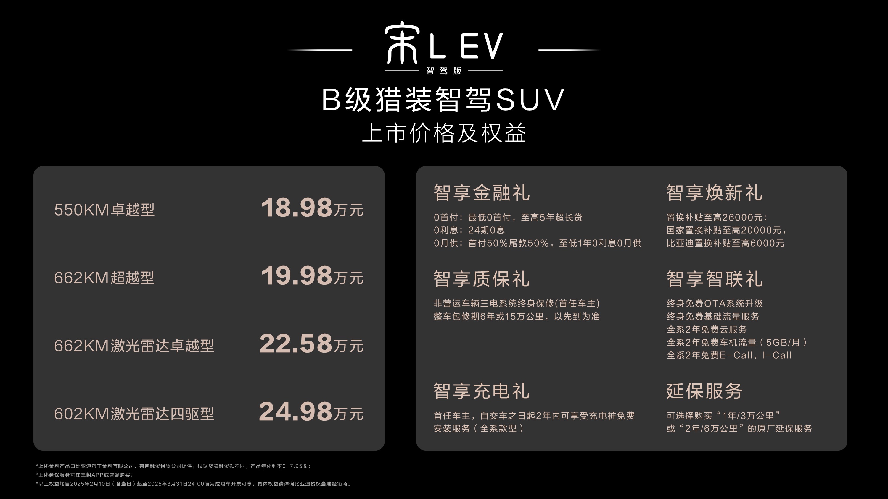 2月10日,B级猎装智驾SUV宋 L EV智驾版正式上市,售价18.98万—24.98万元。秉承“持续进化才是先锋”理念,宋 L EV智驾版“加配不加价”,全系标配高阶智驾,中、高配车型升级激光雷达,搭载天神之眼 B - 高阶智驾激光版(DiPilot 300),开启全面高阶智驾新时代。
