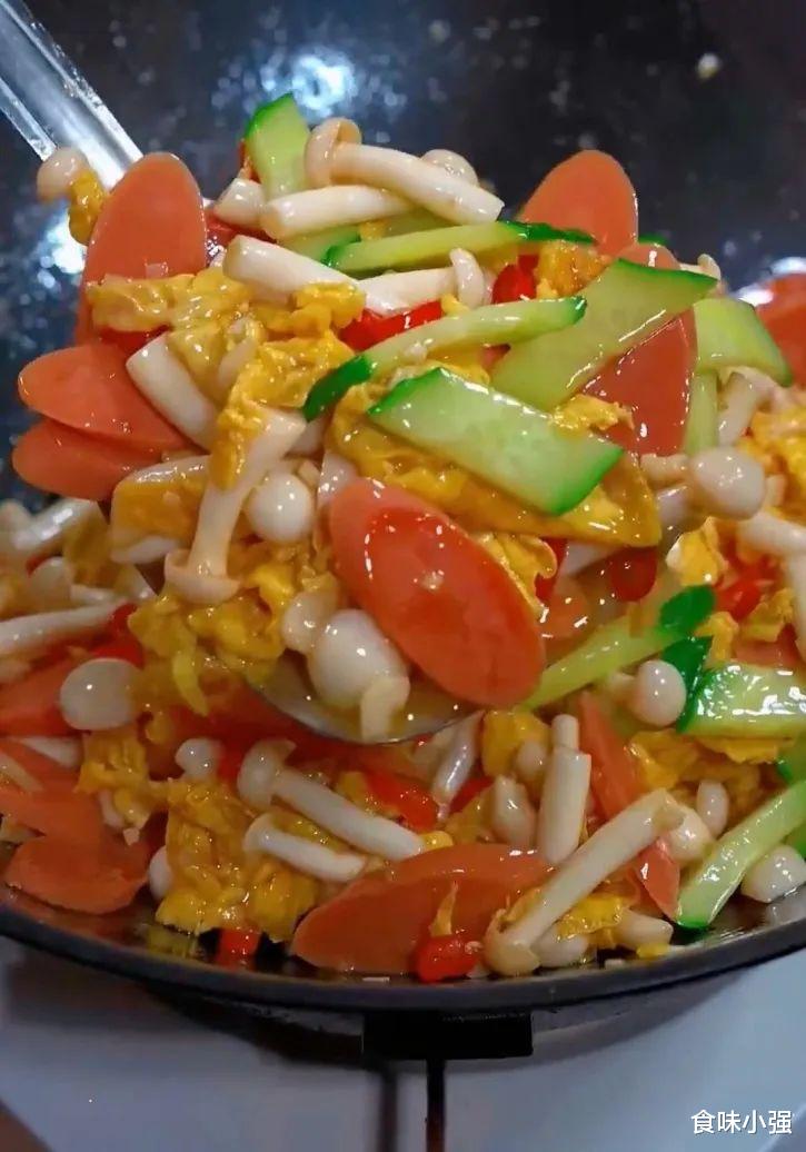 5.倒入菌菇、青瓜、鸡蛋炒至断生,放生抽一点点蚝油、盐和鸡精,翻炒个七八下即可出锅。