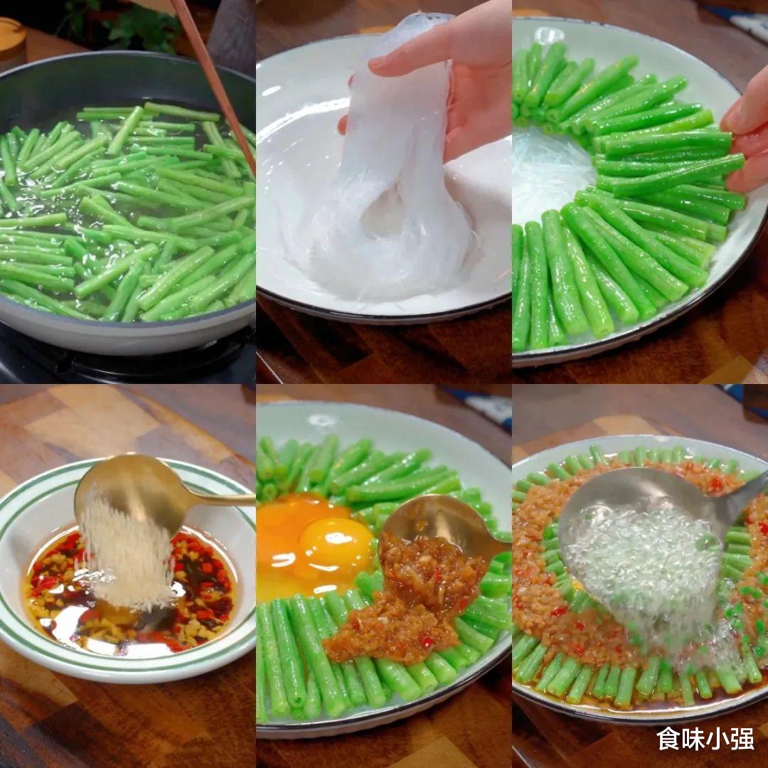 2.盘底铺上泡好的粉丝,整齐地摆上豆角,中间打入一个鸡蛋蛋。