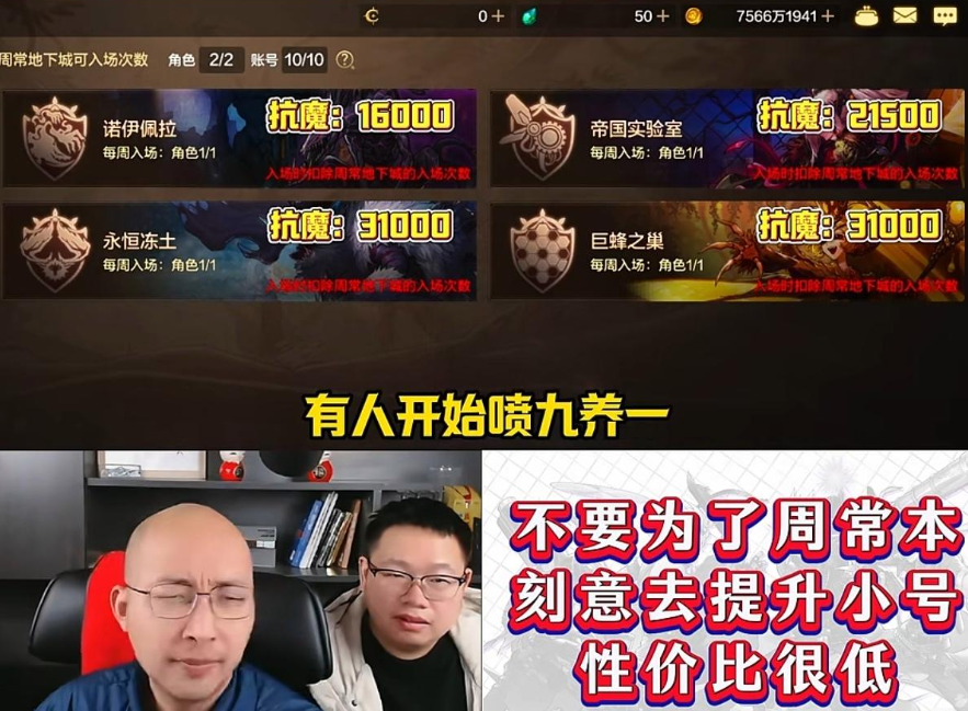 其中奖励最高的巨蜂之巢所要求的最低抗魔值就达到了31000了,而这么高的抗魔值也是让“9养1”玩家天塌了啊。要知道这些玩家虽然玩了非常多的小号,但是这些小号的资源都给了大号,小号根本没有打造什么的,抗魔值也是非常的低。而如今这最良心的周常副本却要求这么高的抗魔值,这也意味着这些玩家的小号根本刷不了这周常副本了啊。