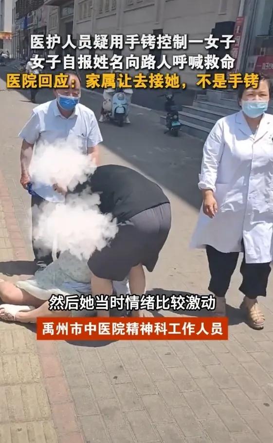 5月16日,一段街头视频冲上热搜。河南禹州某医院门口,穿碎花裙的女子被四名医护人员围住,双手反剪在背后,银色金属环在阳光下刺得人眼疼。路人举着手机边拍边喊:"这哪是救人?明明是抓犯人!"