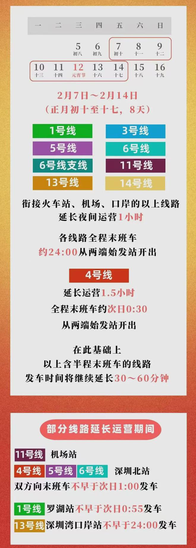 春节假期及前后,深圳地铁全网共延长运营服务时间23天。其中,2月3日至6日,针对深圳北站返深客流夜间集中到达的情况,深圳地铁4、5、6号线及时响应乘客需求,临时调整列车运行安排,在原有延长计划的基础上再延长约75分钟,确保深圳北站双方向末班车不早于2:15发车,有效保证了返深人员的出行。