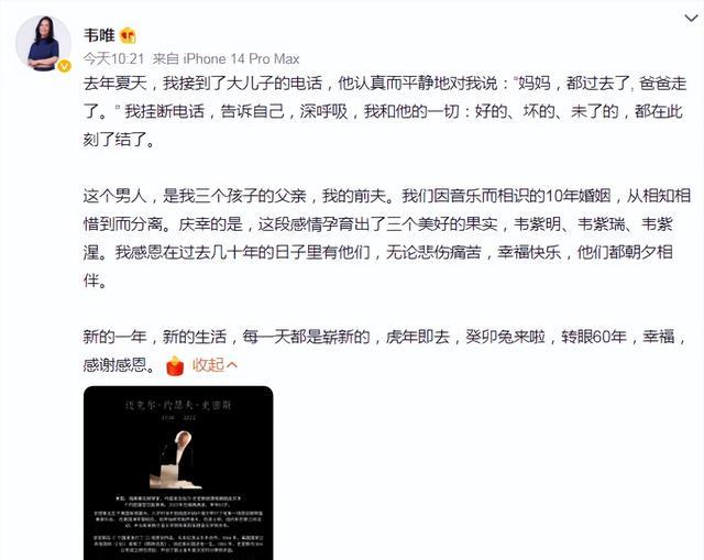 2023年1月,韦唯突然在自己账号上发文,告别前夫迈克尔,直接震惊了全网。