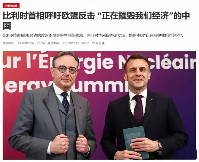据环球网3月24日报道,欧洲媒体披露,比利时首相德韦弗日前致信欧委会主席冯德莱恩,宣称中国“正在摧毁我们的经济”,呼吁在4月举行的欧盟峰会上讨论“对华采取更强硬反制措施”。