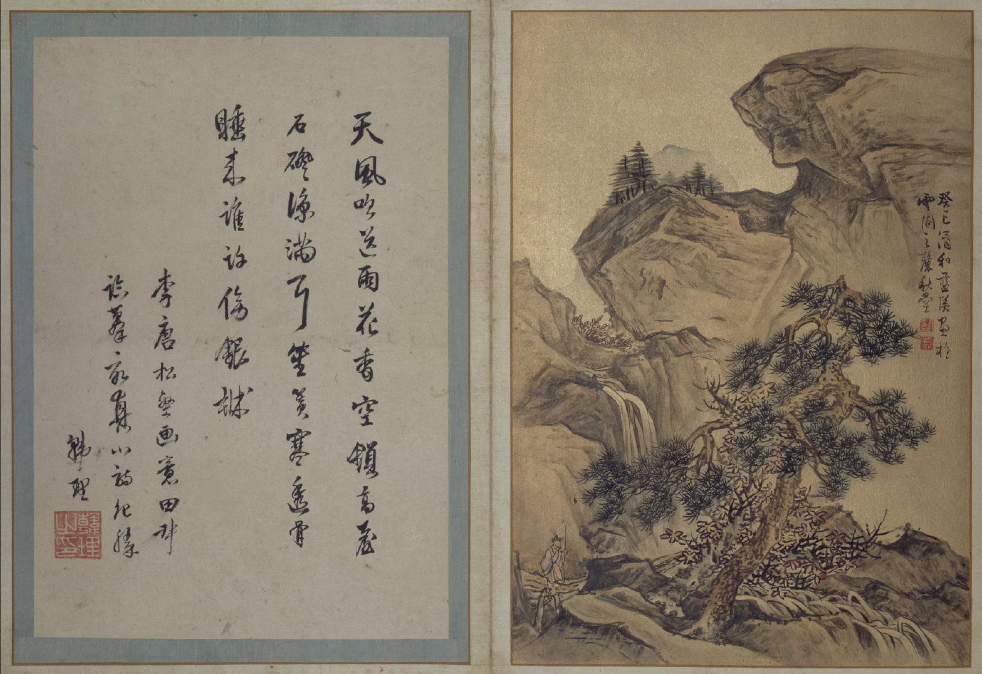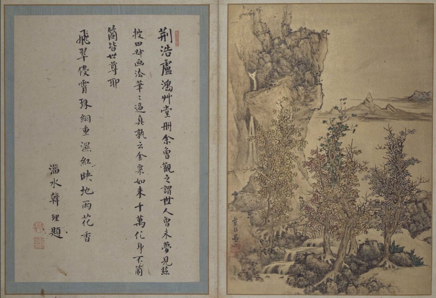 蓝瑛是"善学"的高手。第六开师法马远,北方峰峦用斧劈皴,石棱像刀削过,笔锋硬得能凿出火星,却在山坳里画片云,用淡墨晕得软,刚柔相济间,有了"北派南韵"的活;第三开的没骨法,学张僧繇却不照搬,他把颜色"砸"在纸上,再用清水晕开,让花像从土里"冒"出来,带着股野劲——这哪是仿?是站在古人的肩膀上,说自己的话。