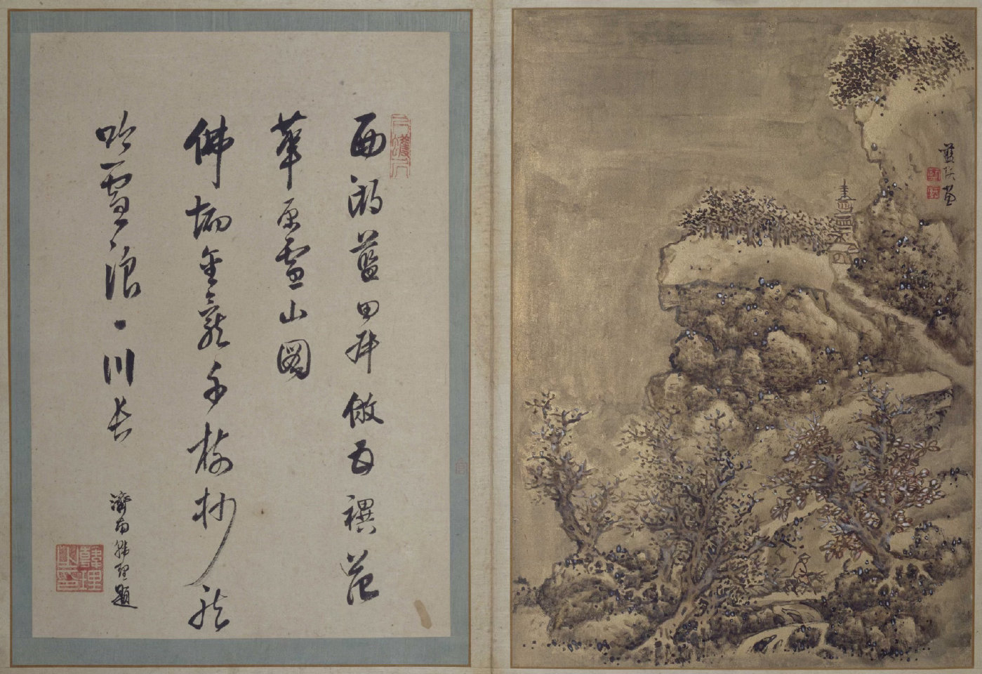 蓝瑛懂"借景说心"。第三开仿张僧繇没骨法,用亮得晃眼的石绿点染春山,桃花用曙红泼洒,像把整个江南的艳都揉了进去,却在山脚藏个茅亭,亭里人低头煮茶——热闹里的静,是春的"道";第四开画冬雪,山石用淡墨勾轮廓,留白当雪,枯树用焦墨拧着,却偏有只寒鸦立在枝头,黑与白撞出暖意——孤寂里的生,是冬的"道"。