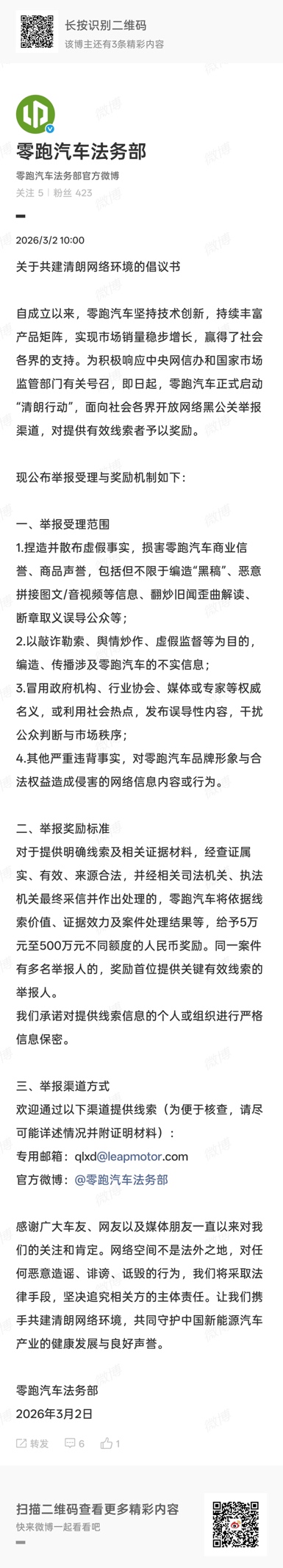 3月2日,零跑汽车正式发布《关于共建清朗网络环境的倡议书》,宣布启动“清朗行动”,面向社会开放网络黑公关举报渠道,单条线索最高奖励达500万元。在国家持续深化“清朗行动”以及行业竞争日趋白热化背景下,零跑打响这场舆论阵地的“保卫战”,不仅是对有组织、有目的恶意抹黑行为的正面回击,更释放出其营造清朗网络环境的强烈决心。
