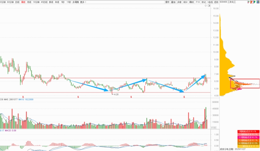 技术分析:从周线上看,股价处于底部位置,维持了2年多的相同震荡平台,目前处于箱体震荡平台的上轨,主力成本区间大概在4.2-6.2一线,并且在5.5元上下形成高度筹码峰。股价即将面临突破,一旦突破就一波主升浪,横有多长竖有多高。