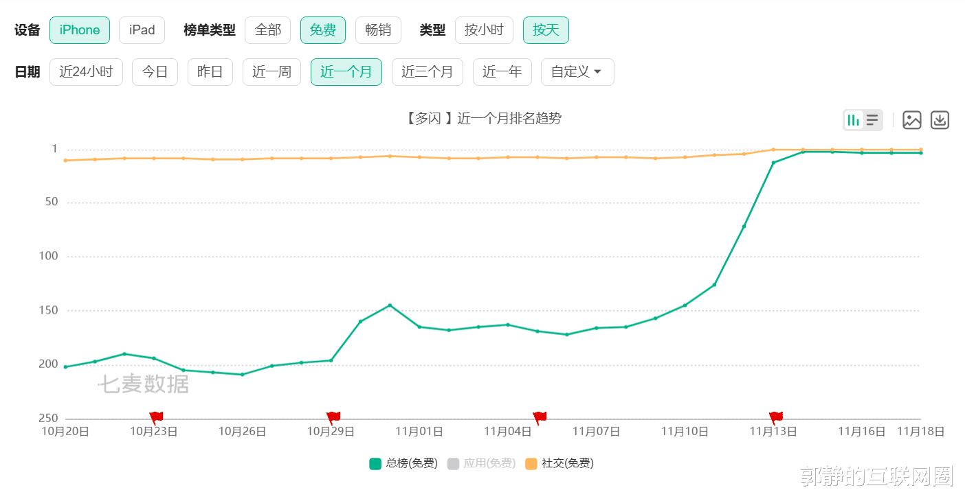 七麦数据显示,“多闪”App在App Store榜单中的变化,始于11月11日左右,从14日开始,“多闪”就在App Store社交榜单中冲到第一名,免费总榜中冲到前五名。为什么“多闪”会从几近于“消失”到App Store社交榜第一?显然,背后正是抖音发了力,抖音为什么会将“多闪”推到前台呢?