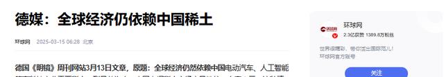 环球网2025-03-15 06:28北京 德媒:全球经济仍依赖中国稀土