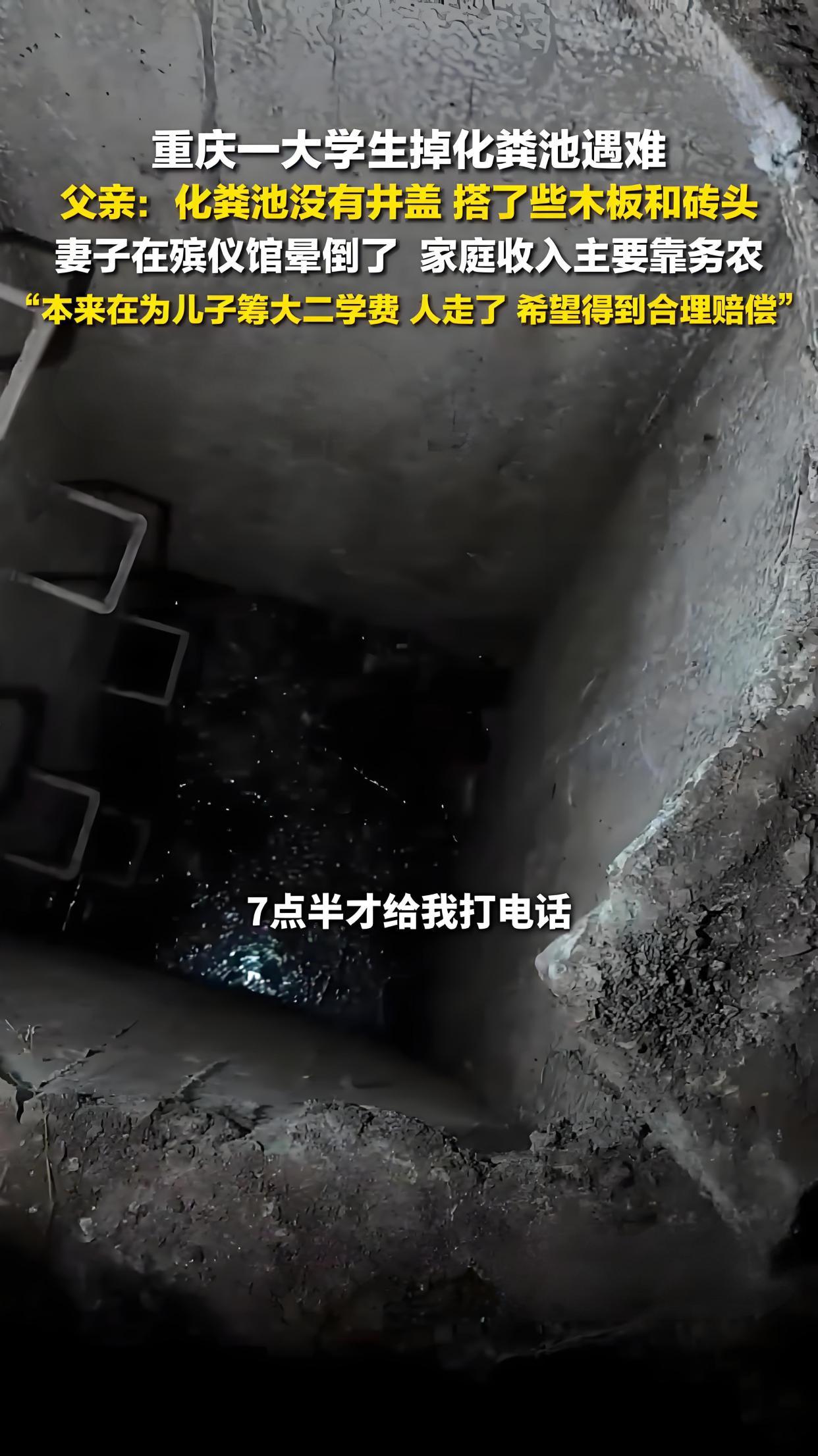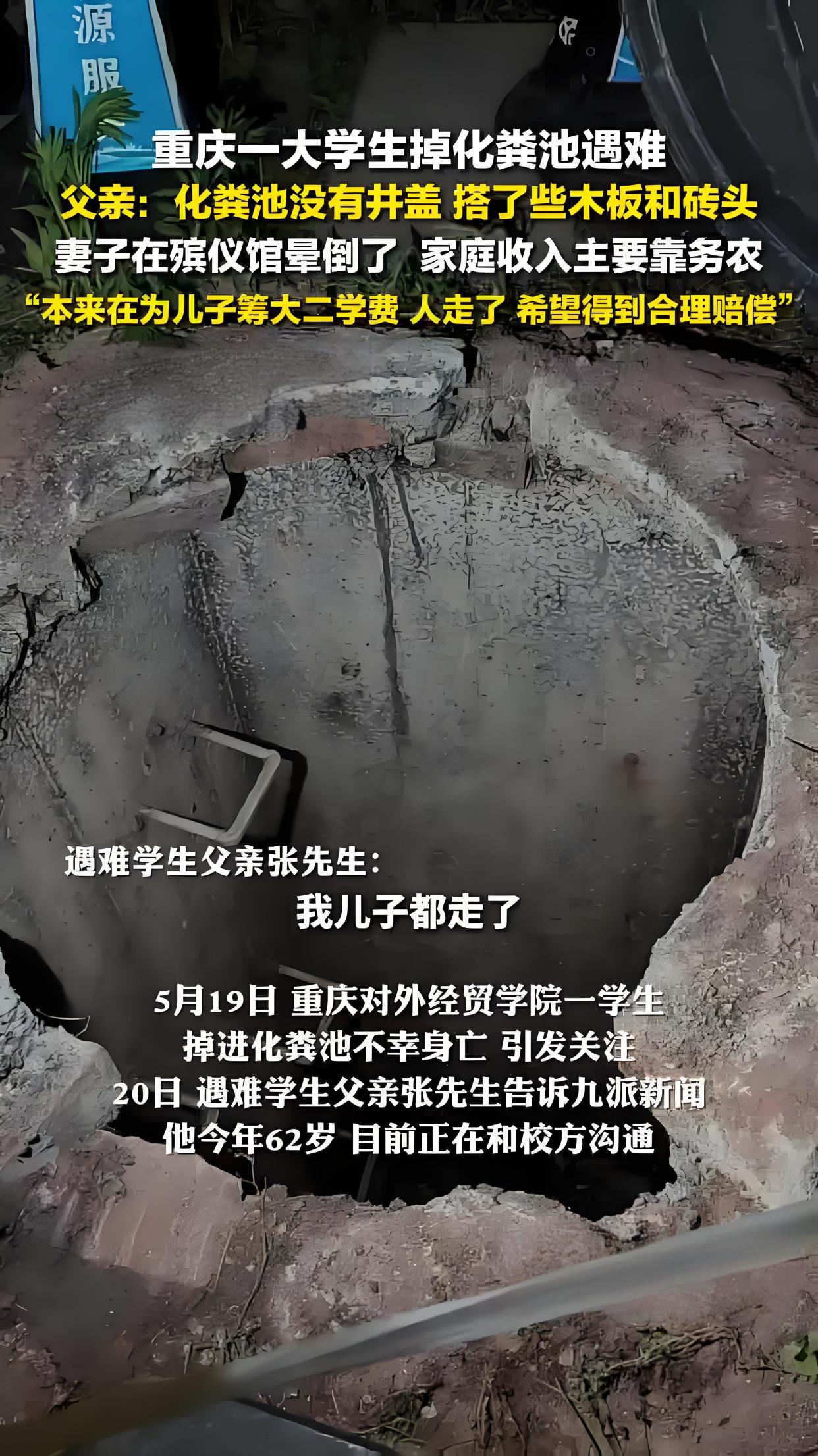 5月19日,重庆对外经贸学院一名20岁男生在归还体育器材途中,因踩空坠入化粪池不幸身亡。其父亲张先生悲痛发声,揭露事发现场仅用腐化木板和砖块遮盖的化粪池口,周围无任何警示标识,引发社会对校园安全管理的强烈质疑。
