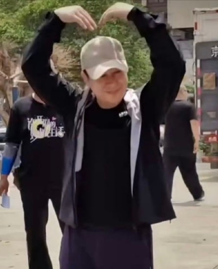 视频中的他穿着一身黑色的衣服,戴着一顶浅咖色的帽子拿着大喇叭在街上对着粉丝们讲话。
