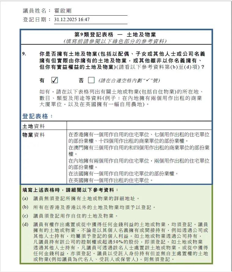 翻查霍启刚上届提交的申报表,他于2022年提到在香港、内地,以及法国和英国拥有物业,但未提及数量。霍启刚在2025年7月申报在港岛有4个物业,九龙有10个。霍启刚主动公开名下物业,让不少内地网友直呼“太坦诚了”、“豪门里的清流”,亦有网友笑言霍启刚是“全球包租公”。霍家最具代表性的豪宅,早已被多次曝光。霍启刚一家五口目前居住的浅水湾豪宅,市值高达1.6亿港币,作为家族重要资产,仅由大房长孙霍启刚继承。