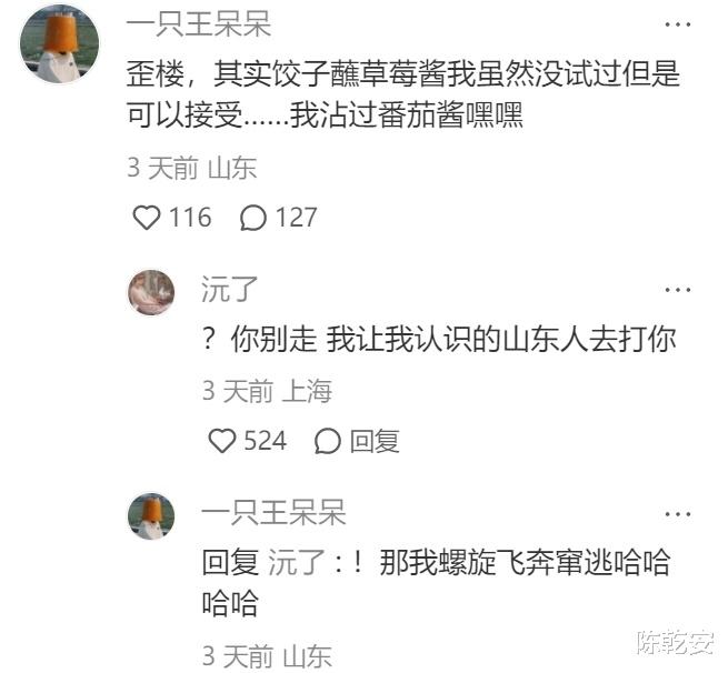 这时候,一位山东网友发言:“其实饺子蘸草莓酱,我没试过,但我感觉能接受……我试过蘸番茄酱,嘿嘿”