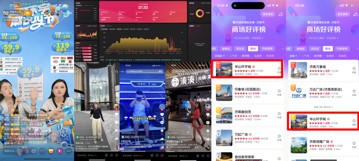 在不断打造年轻活动新玩法的同时,策划团队不忘紧抓节日营销节点,结合商业总部环宇潮buy节,积极策划零售“68团100”、餐饮“78团100”、定点商户专属补贴等促销活动,主打暑期出行嗨吃嗨购,助力商户经营稳步提升;为提升售卖效率,扩大项目影响力,华山环宇城还在抖音推出了「潮BUY直播SHOW」专场直播,通过商场官方号直播和KOL达人视频带货,形成直播内容矩阵。此次直播活动,单场成交额20w+,曝光25w,总GMV达40W+,以较低的成本吸引超100+抖音达人下场带货,有效扩大活动声量。
