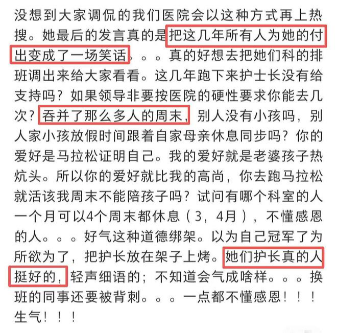 如果换个角度。同事小陈每天任劳任怨,她不嫉妒张水华的奖金或名气,但她清楚地记得那个周六——因为张水华的调休,她不得不连续顶两个夜班,孩子发烧也只能托给婆婆。她的比赛是事,个人的家事就不是事了吗?而她只是张水华同事中的一员,没有马拉松奖金,没有代言合同,只有排班表上密密麻麻的勾叉。“凭什么?”