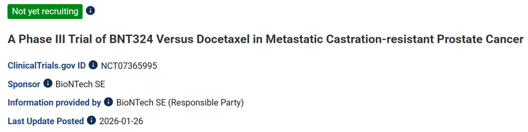 1月26日,美国临床试验收录网站显示,BioNTech启动了BNT324(DB-1311)的首个III期临床试验。该药物是第5款进入III期阶段的B7-H3 ADC。