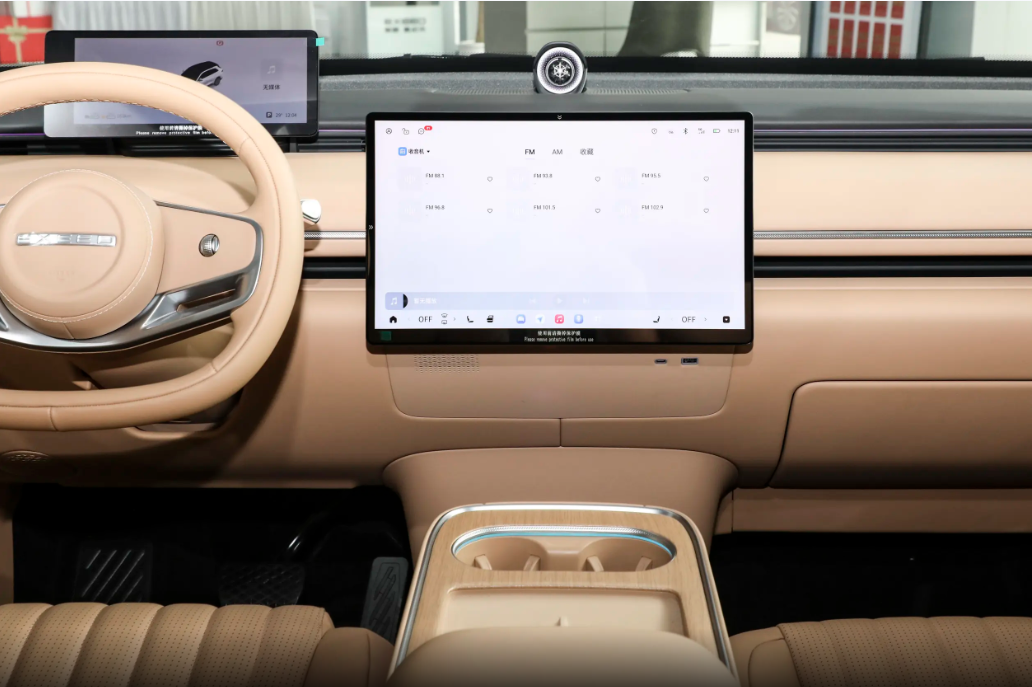 来到车内,可以看出星途星纪元ET的内饰采用了简洁且规则的设计风格,而中控台还采用了平直线条以及镀铬件进行装饰从而带来不错的层次感。中控区域采用悬浮式10.25英寸全液晶仪表盘与15.6英寸超清中控触屏的双屏组合,不仅科技感十足,更在实际操作中提供清晰便捷的信息交互。电子怀挡设计的加入进一步强化了其新能源车型的身份特征,省去了传统挡把结构,使中央通道区域更显简洁与实用。