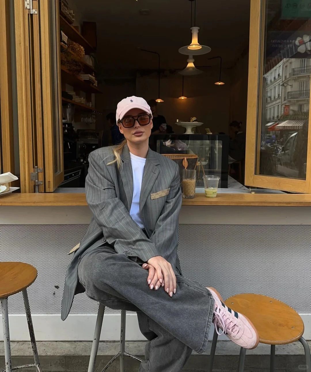 如中性色西装+糖果色衬衫+白T恤上,
