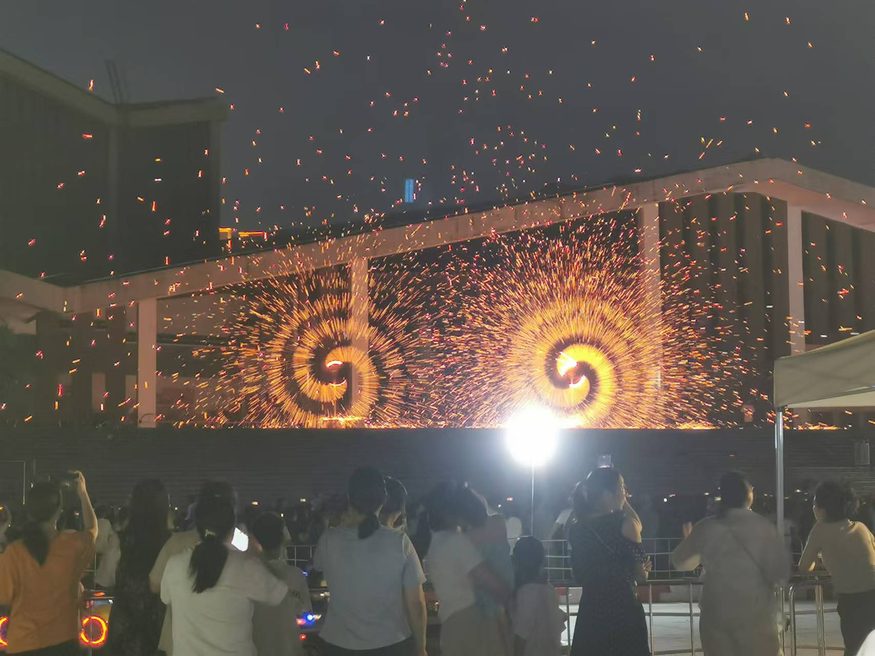 晚上7:30、8:30和9:30的非物质文化遗产项目“火壶”和两个“风火轮”表演是广大市民朋友和游客最喜欢观看的表演。当焰火点燃时,化为璀璨星光,那一抖、一敲、一洒,如星河闪烁,令现场游客和市民惊叹不已,大家纷纷掏出手机和相机记录下眼前流光溢彩的美好时刻。