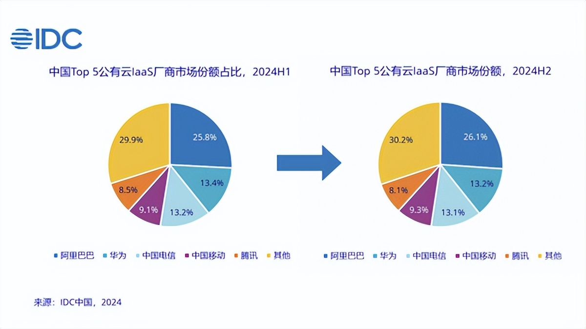 在去年下半年,华为在中国前五大公有云 IaaS(基础设施即服务)供应商中占据了 13.2% 的市场份额。IDC报告显示,阿里巴巴在 2024 年下半年以 26.1% 的市场份额位列第一。其大幅增加研发投入,并加大了通义系列大模型以及人工智能基础设施方面的努力。