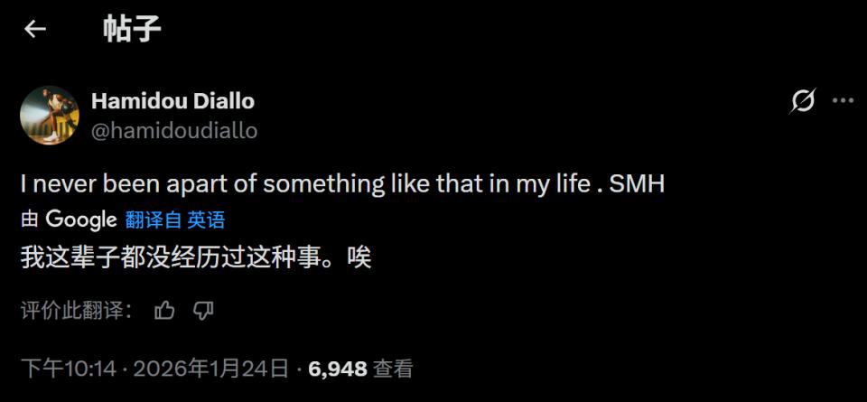 在这样一场火药味十足的比赛中,山西队外援迪亚洛成为了争议的核心漩涡,受到犯规困扰的他全场领到了4次个人犯规,导致上场时间被严重压缩。更令人侧目的是他在比赛中展现出的情绪化行为,除了多次挑衅广东球员以及现场观众引发漫天嘘声外,他甚至做出了数钱的手势来挑衅当值裁判。这种行为在职业赛场上极为罕见且性质恶劣,不仅未能帮助球队追分,反而让场面陷入了更深的混乱之中。赛后,迪亚洛的情绪显然没有平复。他在深夜通过个人社交媒体发布了一条动态,直言:“我这辈子从未经历过这样的事情,真是无语。”这句话迅速在网络上引起了轩然大波。一位自称山西忠实支持者的球迷特意留言声援,表示理解比赛的艰难,认为迪亚洛在场上遭受了不公平的违例吹罚。