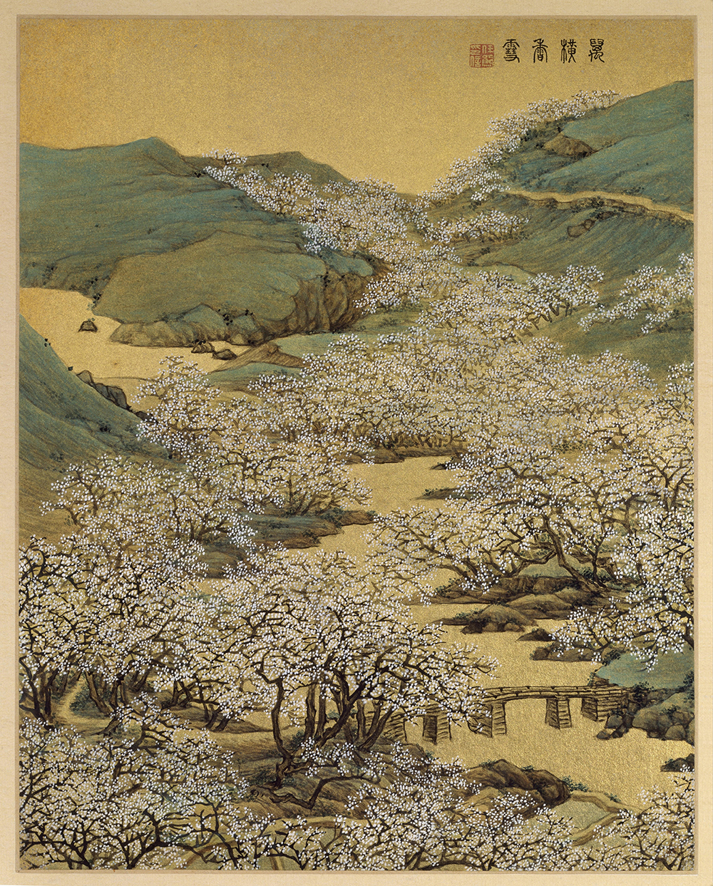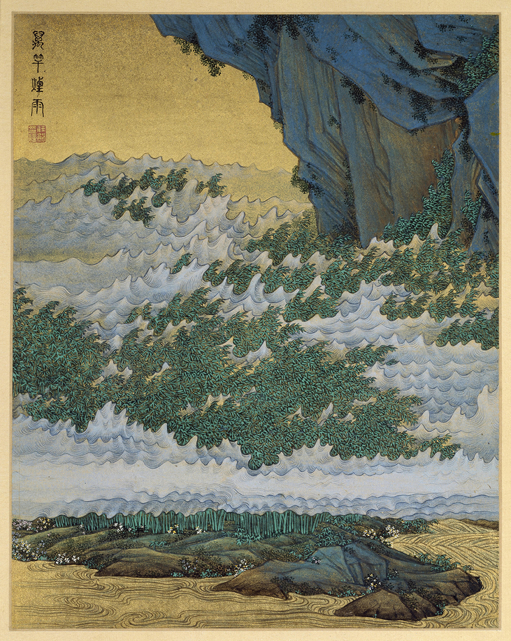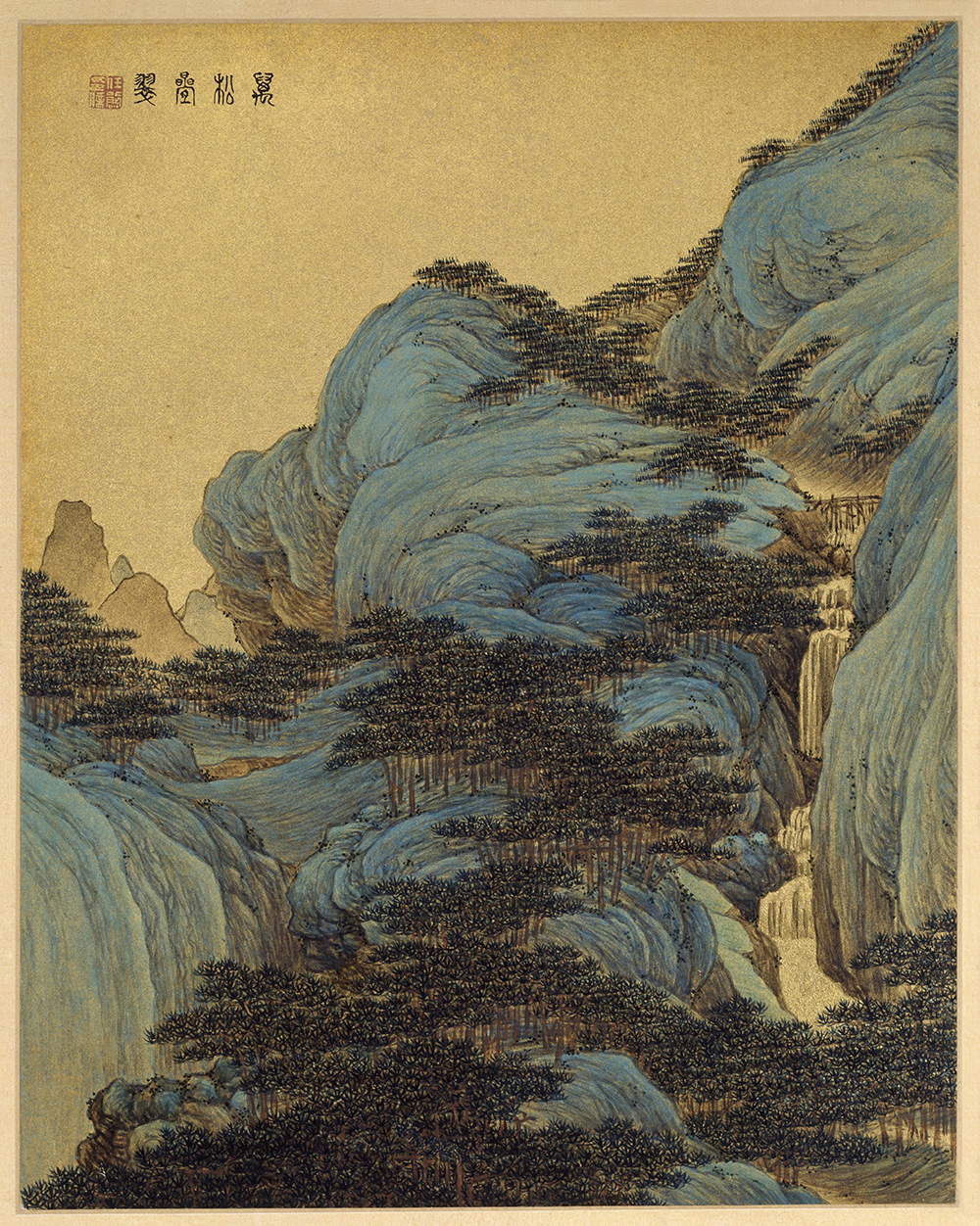 清代任熊的《十万图册》包含十幅小青绿山水画作,题目皆以 “万” 字起首,每页篆书题名,钤印其上。现藏于北京故宫博物院的此图册,以泥金笺青绿设色。