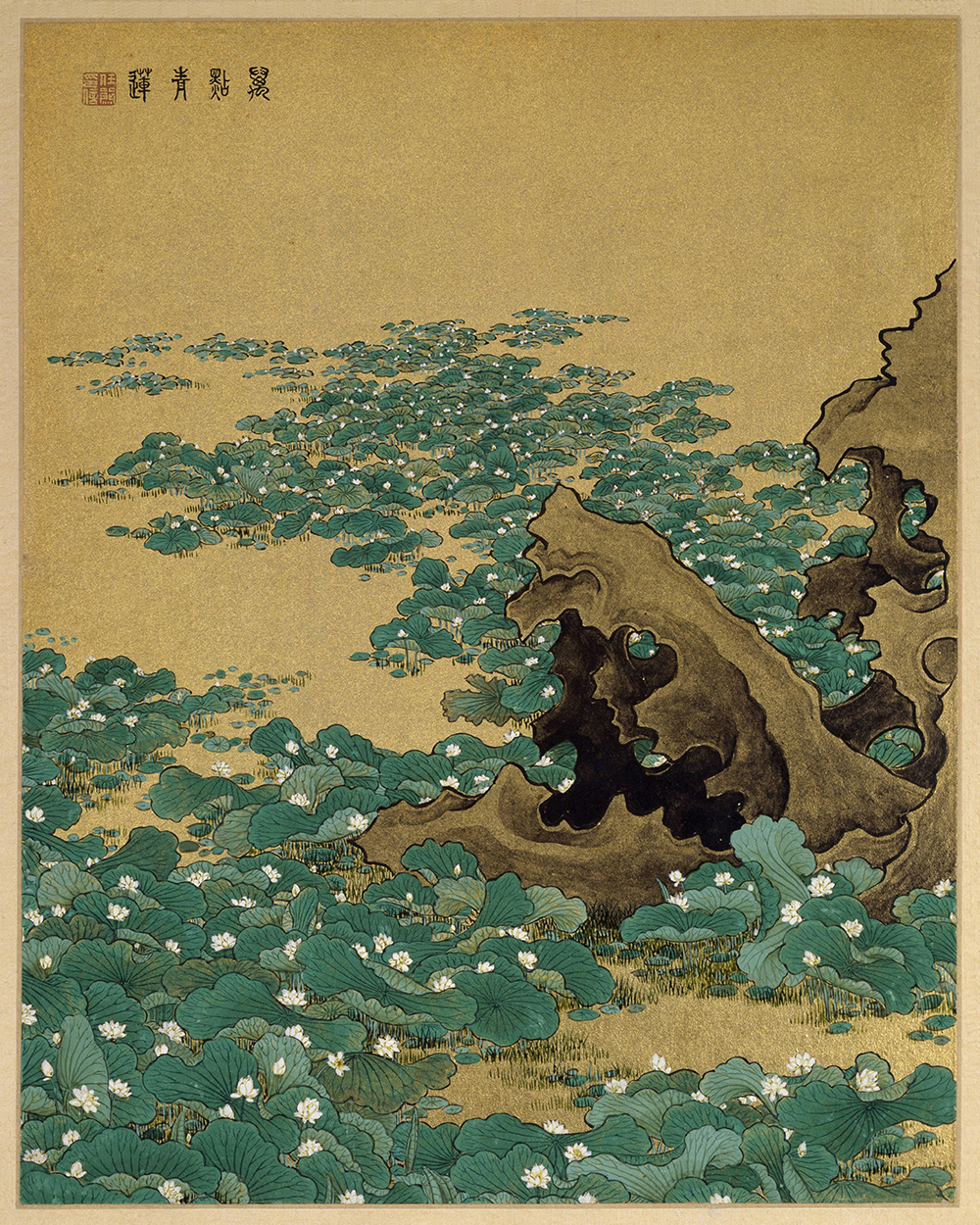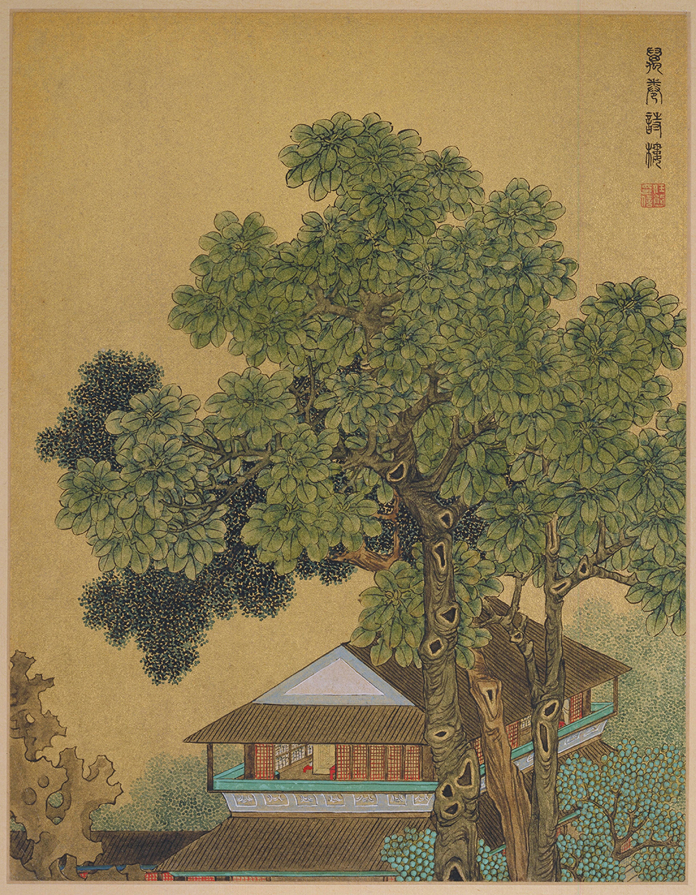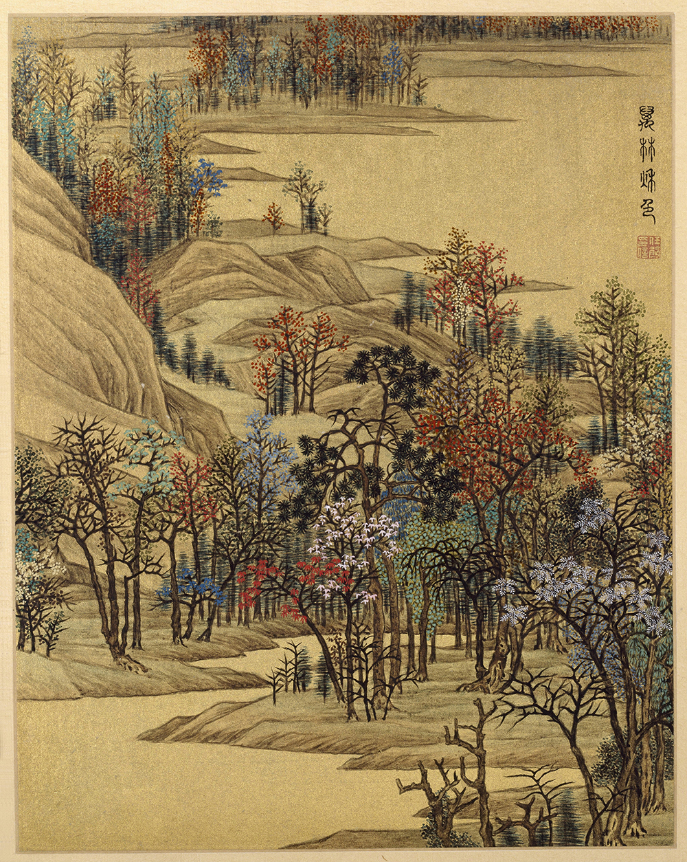 清代任熊的《十万图册》包含十幅小青绿山水画作,题目皆以 “万” 字起首,每页篆书题名,钤印其上。现藏于北京故宫博物院的此图册,以泥金笺青绿设色。