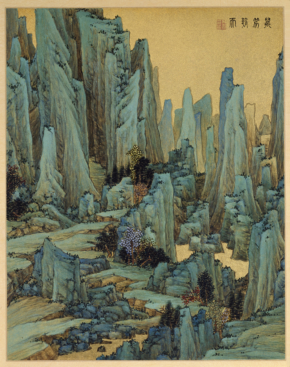 万笏朝天,以苏州天平山为题材。壁立的群山,山峰陡峭,直上直下,山石间点缀有小片的树丛,展现出山峰的雄伟险峻和一种庄严肃穆的气势。