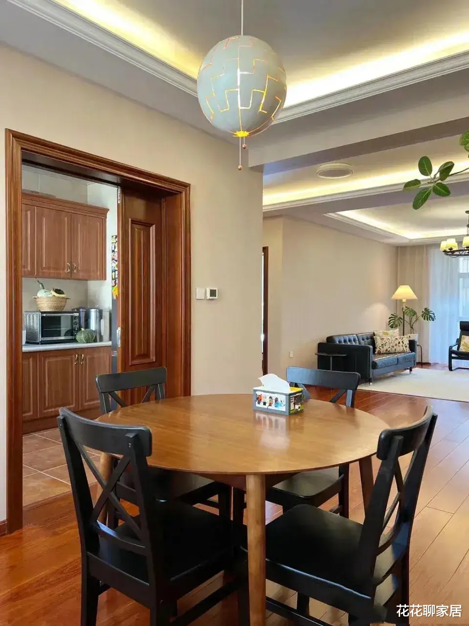 餐厅这边,布置了一张圆形实木餐桌,木质桌面的深沉色调与地板色彩相得益彰,使得整个餐厅的装饰风格变得和谐统一。