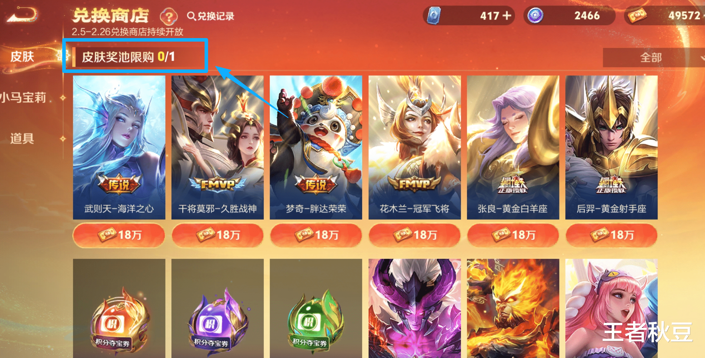 理想很美好,现实却很残酷,在兑换商店的左上角,有一个行不算太明显的字——“皮肤奖励池限购一个!皮肤奖励只能领取一个!