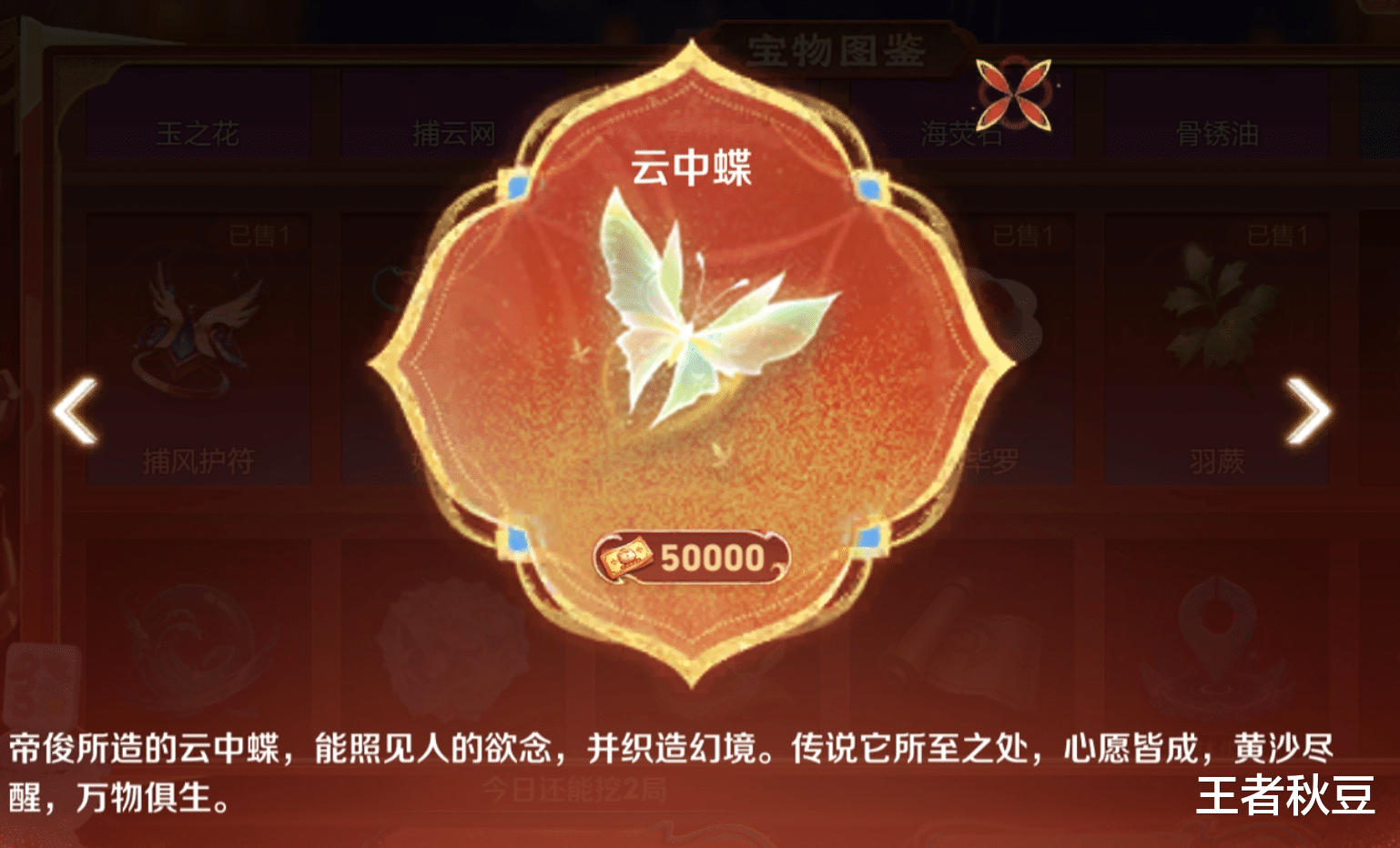 每天的挖宝可以挖出珍贵、稀有和普通三种品质,每天挖去的前十个宝物必定有一个云中蝶外的珍贵宝物。根据图鉴的售卖价格来说,平均下来每天挖宝也能获得8000的小马钱,15天也能够9万小马钱。