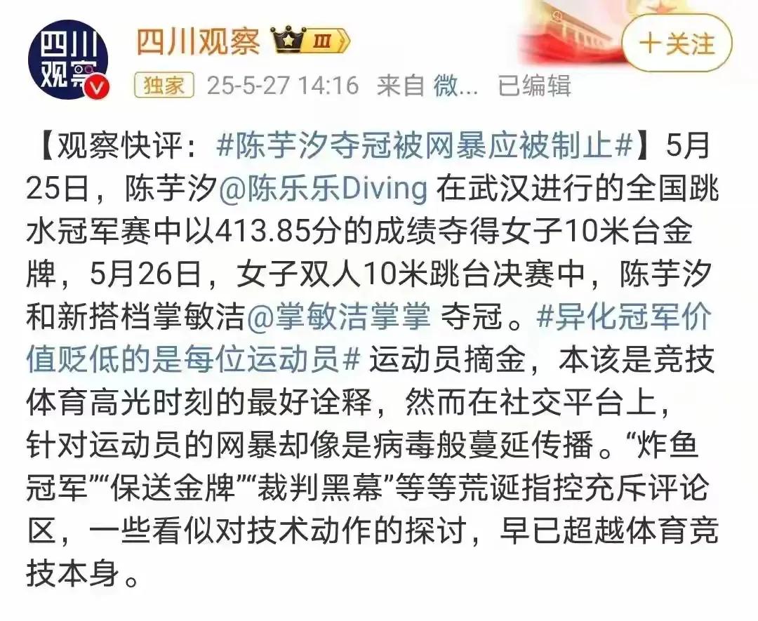说实话小编是全红婵的粉丝,喜欢她同时也认为陈芋汐是优秀的跳水运动员,可惜与婵宝生于同一个时代,饭圈文化该整顿了,网络不是法外之地,言论自由不是胡言乱语,任行而为,应力惩不负责任的胡说八道,以法促清。对进行网暴的网友一个劝告:请手下留情,嘴下留情。请多给运动员一些鼓励鼓励,少些指责和打击。
