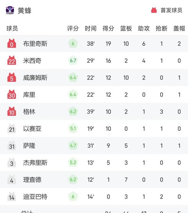 黄蜂首发:米西奇 、格林、布里奇斯、库里、马威
