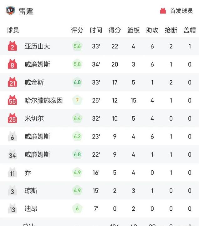 在本场对决中,雷霆队的内线悍将哈尔滕施泰因大放异彩,他不仅进攻端效率奇高,更展现出全面的身手,轻松斩获两双佳绩。在仅仅25分半的出场时间里,他7次出手命中6球,高效砍下12分,并摘下15个篮板,送出4次助攻,还有1次抢断入账,个人正负值高达+10,为球队的胜利立下了汗马功劳。