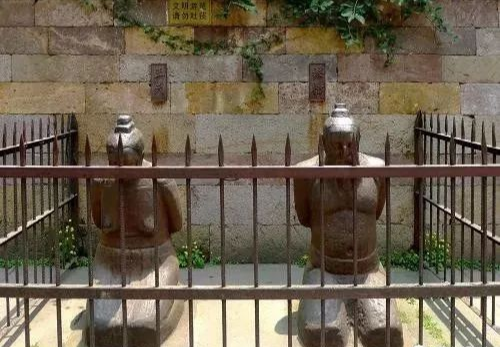 另有一副颇为风趣,别具一格,是以秦桧夫妇的口吻拟就的,原来挂在两人跪像的颈上: