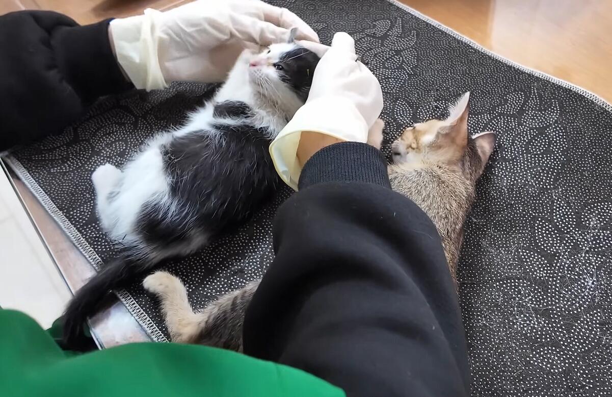 然而,救治过程中并非一切都顺利。那只有腹泻症状的小猫,情况依旧非常严峻,医生建议再给它注射一些药物,以防止感染扩散。尽管如此,它的状态在逐渐好转,显然已经有了些许恢复的迹象。