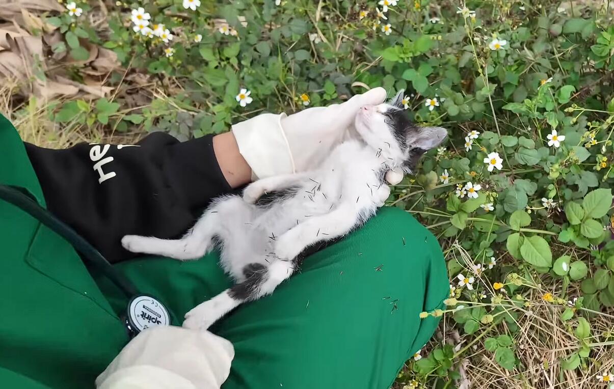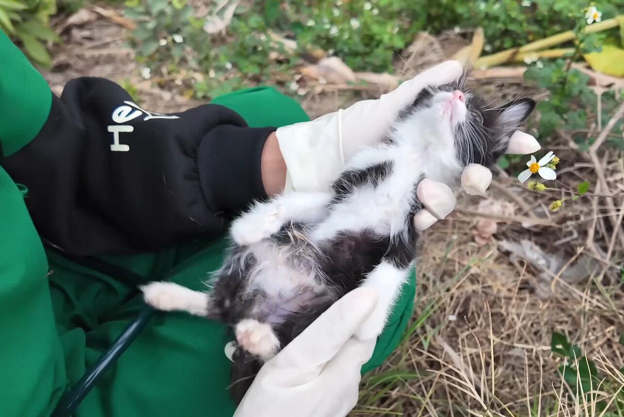 然而,这只小猫并非孤单。周围的灌木丛里,还有另外几只小猫也面临着同样的命运。有的已昏迷不醒,有的则有腹泻的症状,情况都很不容乐观。尽管如此,小姐姐并没有放弃,她逐一检查了每只小猫,尽快决定将它们带到附近的诊所进行救治。