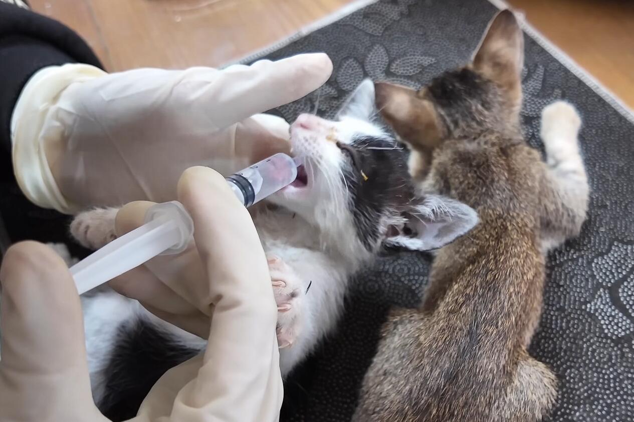 另外两只小猫的情况也不容乐观。它们都很虚弱,呼吸微弱,眼睛也有些疼痛。经过初步的救治,小姐姐赶紧为它们补充葡萄糖,以提高它们的血糖水平,帮助它们恢复体力。幸运的是,两只小猫吃得很急,像是饿坏了,几乎不曾停下来喘气。喂食之后,经过一些时间休息,这两只小猫逐渐恢复了些许精神,呼吸也开始平稳下来。