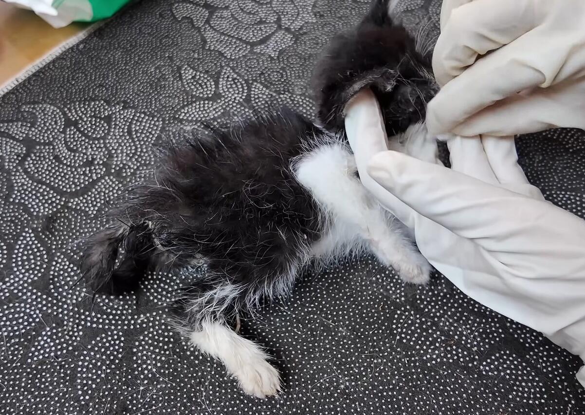 到了诊所后,最严重的那只小猫因为长时间腹泻并且脱水,需要进行静脉输液。它的情况非常危急,需要立刻处理。在工作人员的帮助下,小猫得到了及时的治疗。