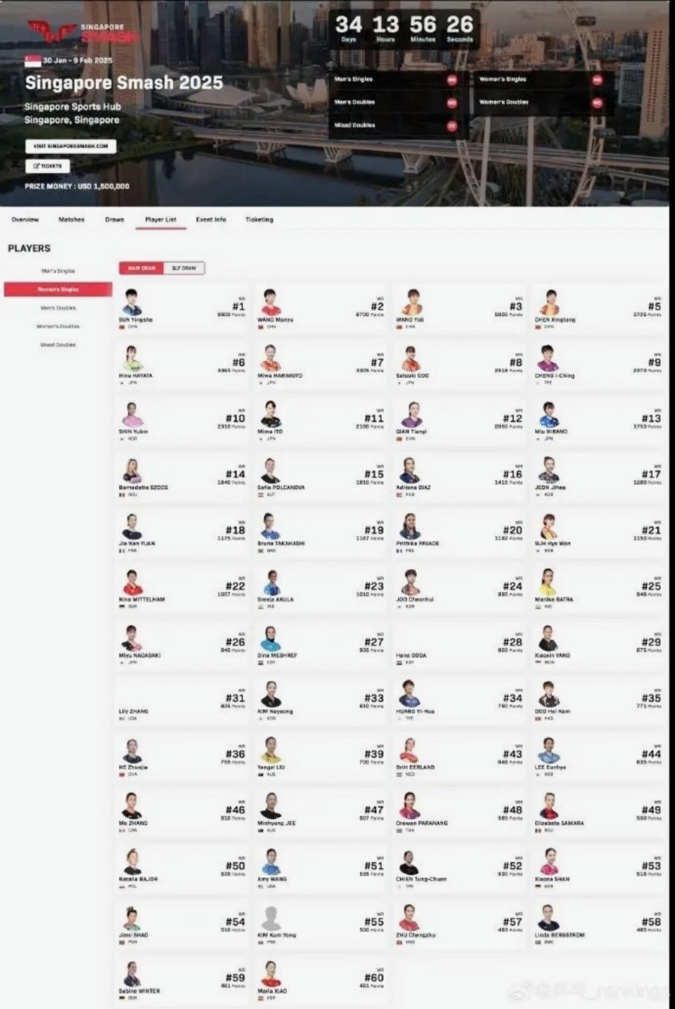 随着2025年WTT赛历公布,部分站点的参赛名单也陆续发布。北京时间12月26日,国际乒联公布2025年新加坡大满贯单打参赛名单。国乒王楚钦和孙颖莎领衔参赛,12名顶级选手入选单打阵容。