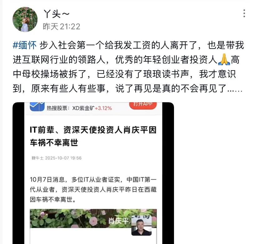 10月7日下午资深投资人邓飞(肖庆平生前好友)在社交平台发布了这一悲痛的消息,文中他叙述了自己的好友在去西藏旅游途中发生车祸意外导致导致去世。